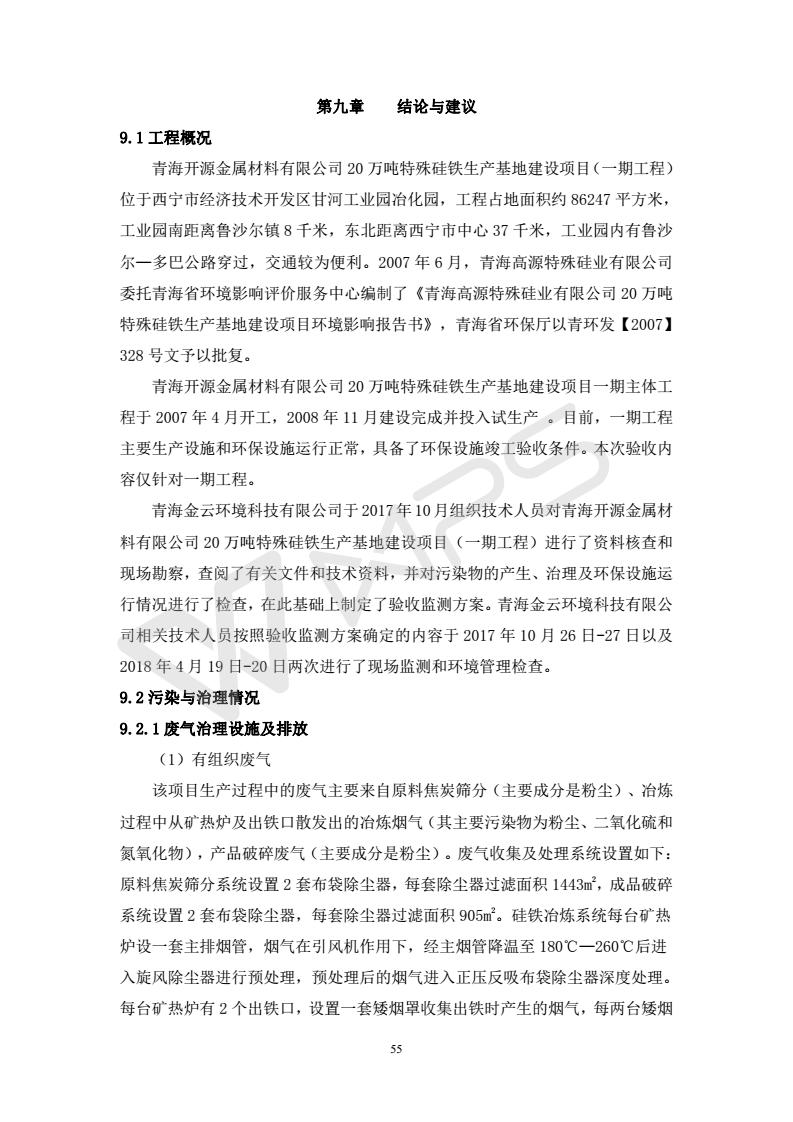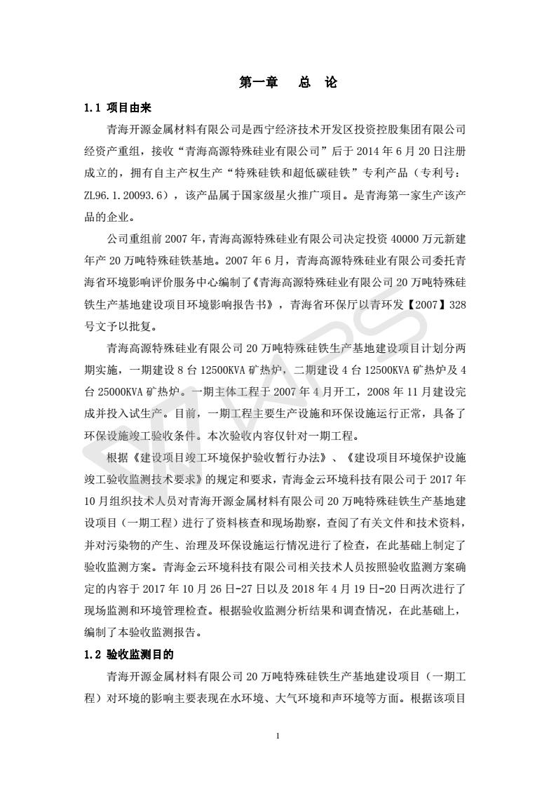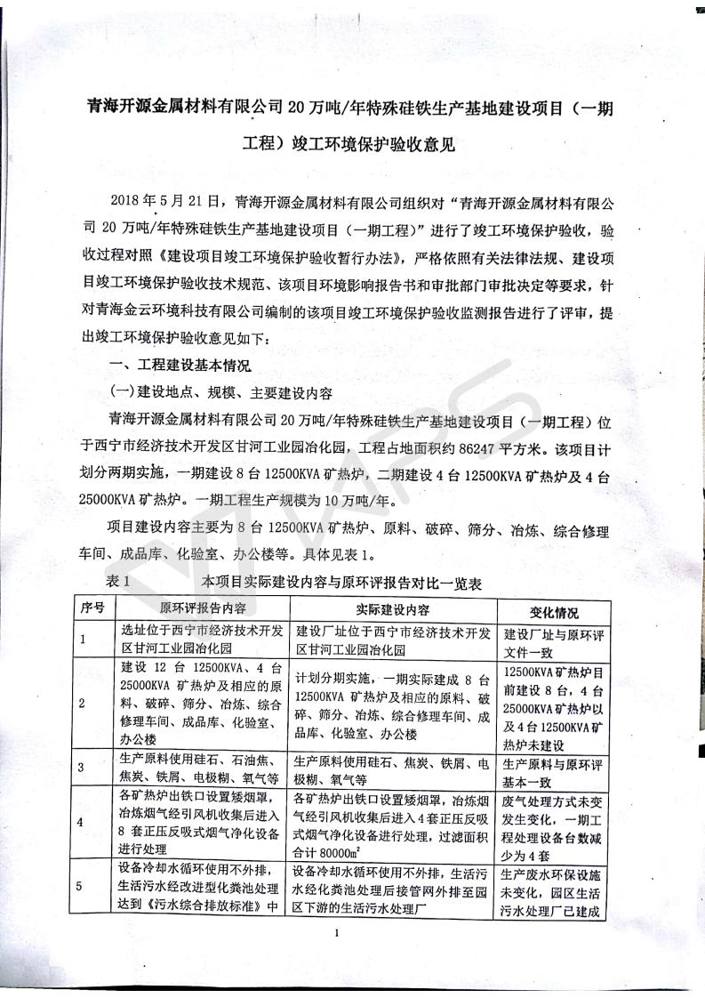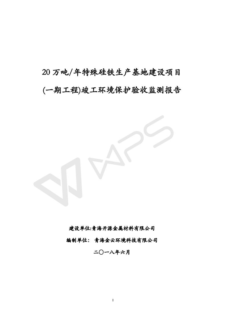 青海開源金屬材料有限公司20萬噸特殊硅鐵生產(chǎn)基地建設(shè)項(xiàng)目(一期工程)竣工環(huán)境保護(hù)驗(yàn)收報(bào)告書會(huì)后修改20180521