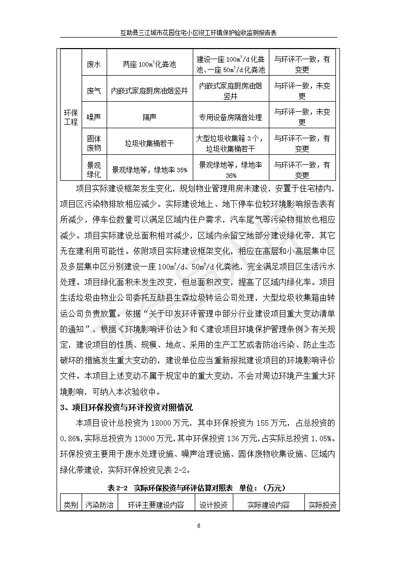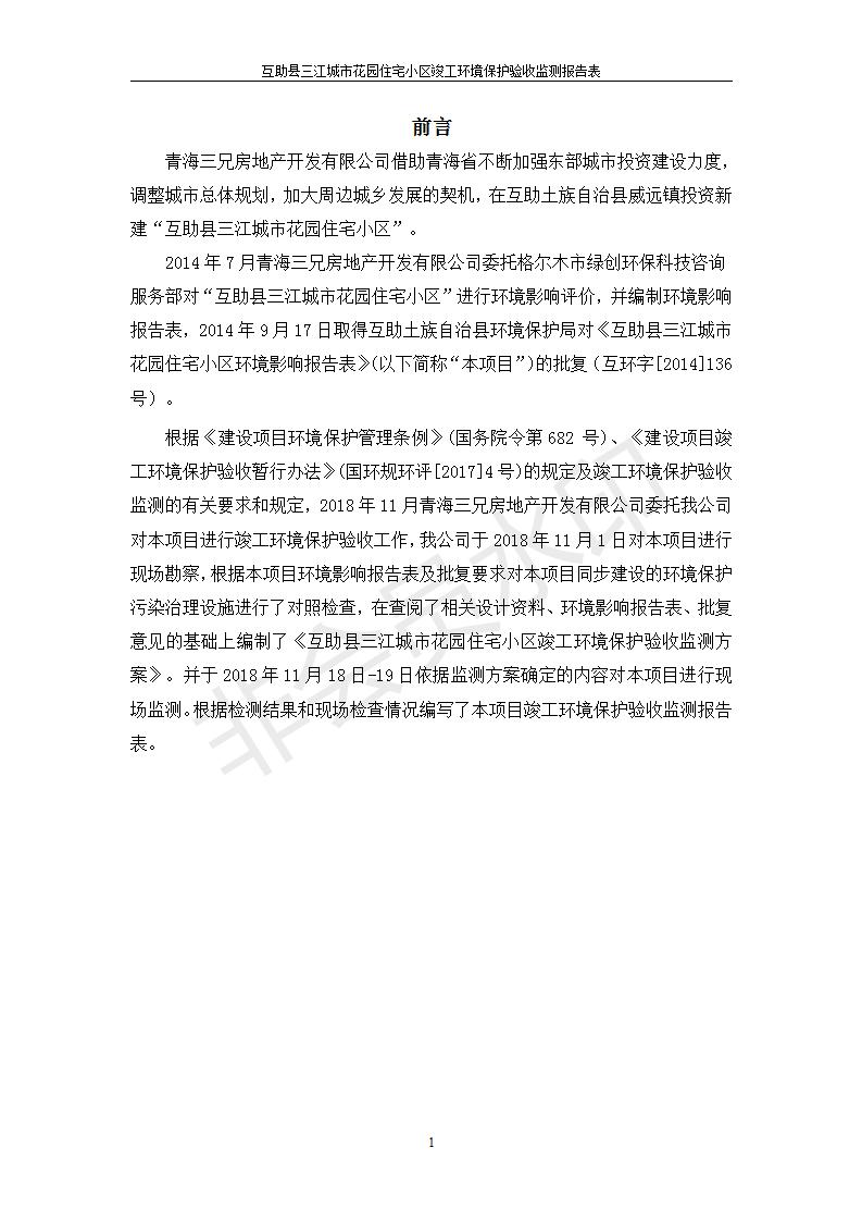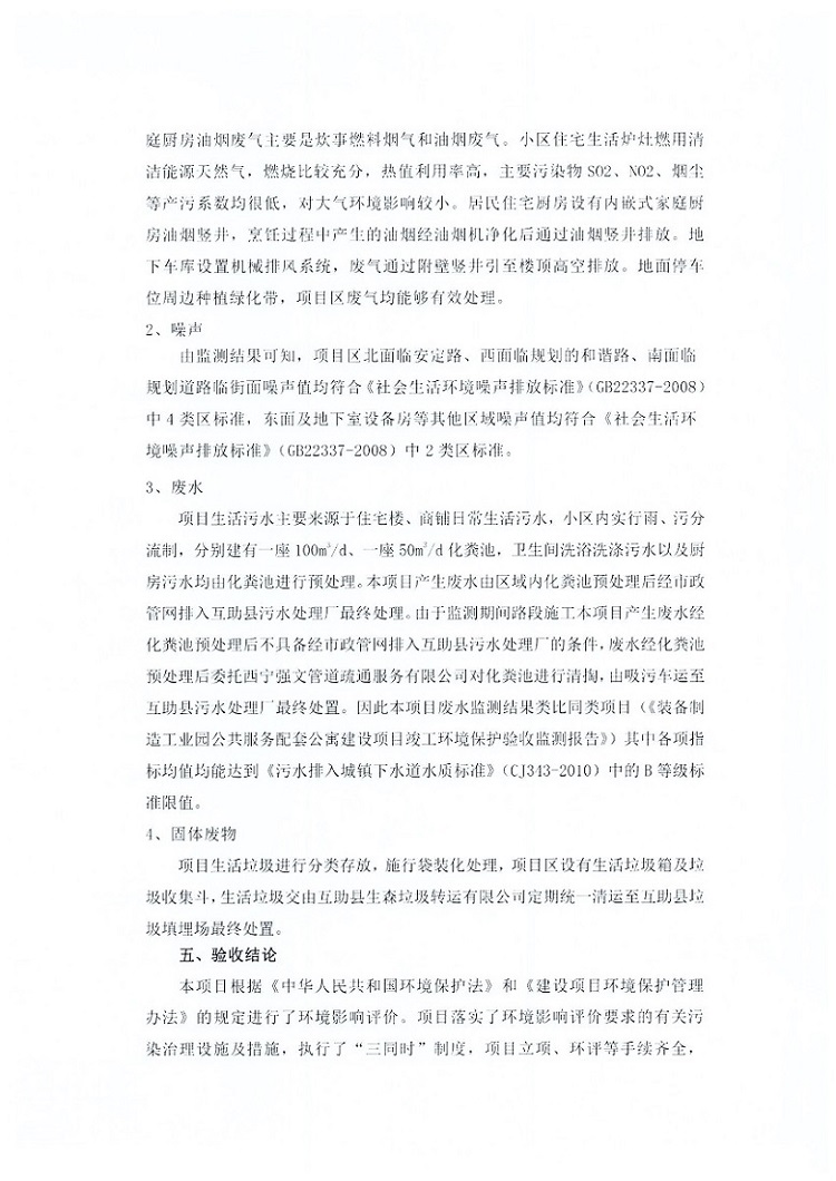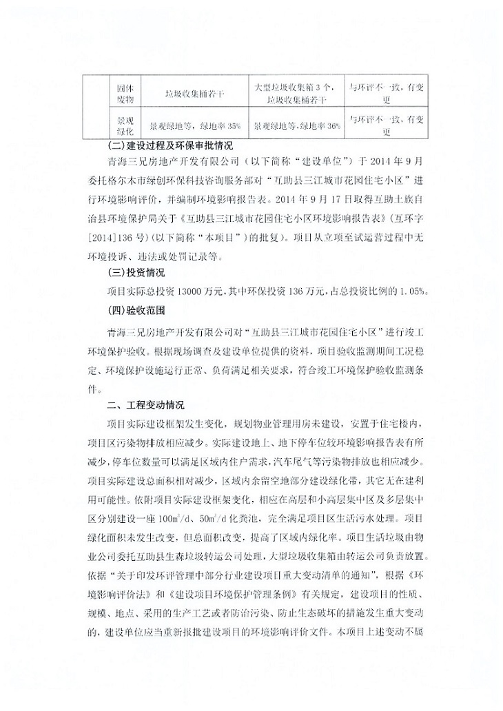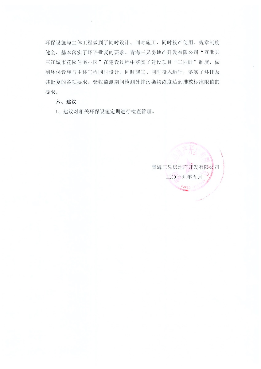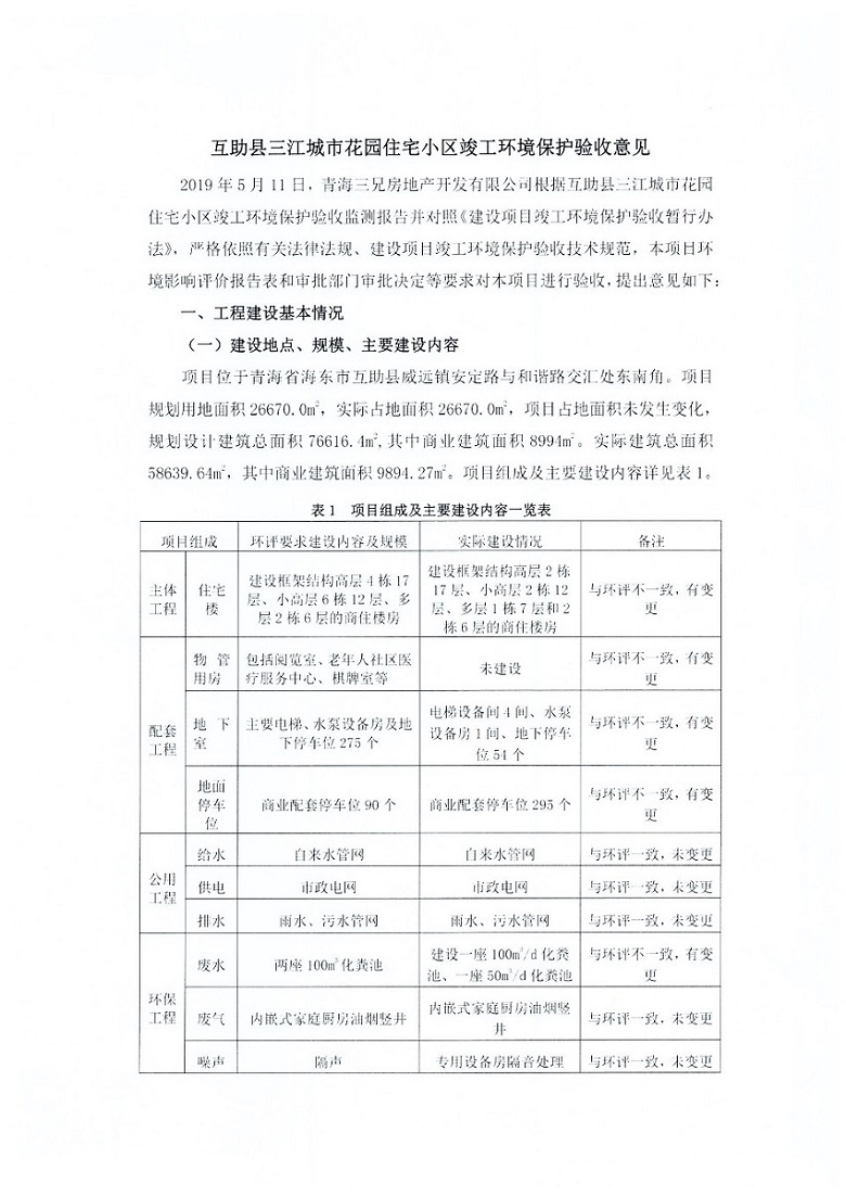 根據(jù)中華人民共和國國務(wù)院令第682號《國務(wù)院關(guān)于修改〈建設(shè)項目環(huán)境保護管理條例〉的決定》和《建設(shè)項目竣工環(huán)境保護驗收暫行辦法》(國務(wù)院令682號),互助縣三江城市花園住宅小區(qū)(包括竣工環(huán)境保護驗收監(jiān)測報告表和驗收意見)公示如下。 一、項目名稱: 互助縣三江城市花園住宅小區(qū)竣工環(huán)境保護驗收監(jiān)測報告表 二、地點:青海省海東市互助土族自治縣威遠鎮(zhèn)安定路與和諧路交匯處東南角 三、建設(shè)單位:青海三兄房地產(chǎn)開發(fā)有限公司 四、建設(shè)內(nèi)容:項目規(guī)劃用地面積26670.0m2,實際占地面積26670.0m2,項目占地面積未發(fā)生變化,規(guī)劃設(shè)計建筑總面積76616.4m2,其中商業(yè)建筑面積8994m2。實際建筑總面積58639.64m2,其中商業(yè)建筑面積9894.27m2。 五、聯(lián)系人:張工 六、聯(lián)系電 話:0971-6515411 七、公示時間:二〇一九年六月五日至二〇一九年七月三日 公示期間,對上述公示內(nèi)容如有異議,請以書面形式反饋,個人須署真實姓名,單位須加蓋公章。