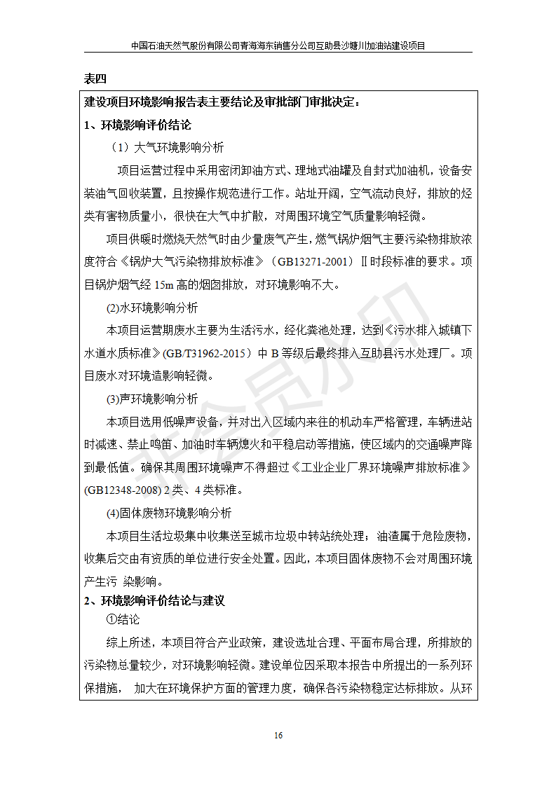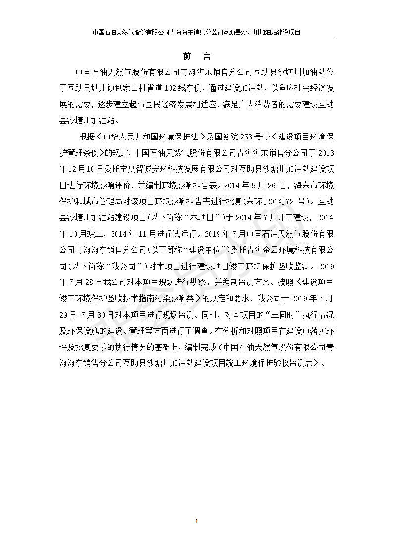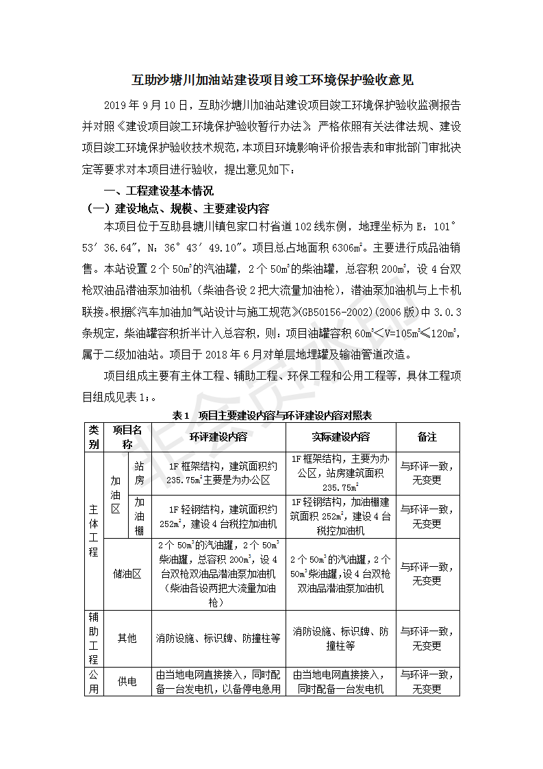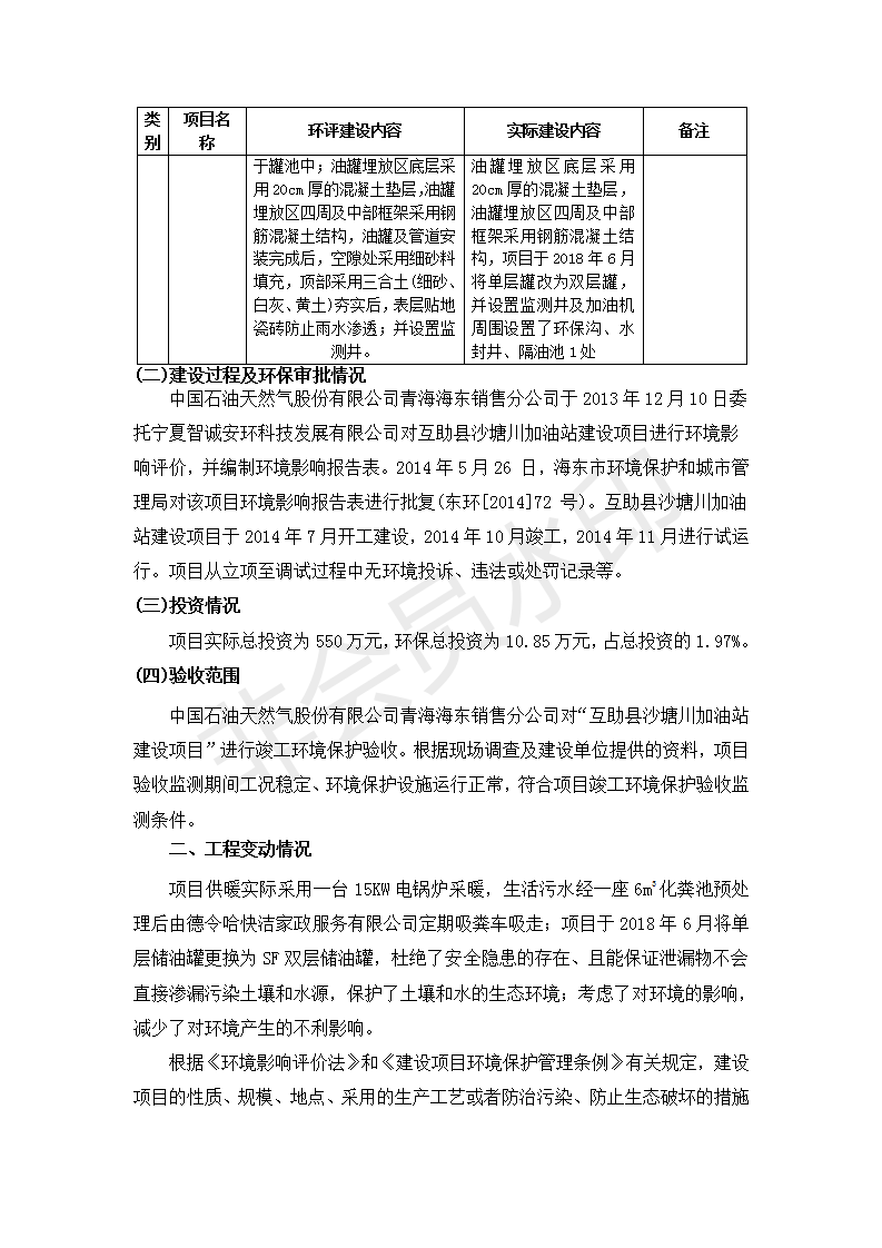 根據(jù)中華人民共和國國務(wù)院令第682號(hào)《國務(wù)院關(guān)于修改〈建設(shè)項(xiàng)目環(huán)境保護(hù)管理?xiàng)l例〉的決定》和《建設(shè)項(xiàng)目竣工環(huán)境保護(hù)驗(yàn)收暫行辦法》(國務(wù)院令682號(hào)),互助縣沙塘川加油站建設(shè)項(xiàng)目(包括竣工環(huán)境保護(hù)驗(yàn)收監(jiān)測(cè)報(bào)告表和驗(yàn)收意見)公示如下。 一、項(xiàng)目名稱:互助縣沙塘川加油站建設(shè)項(xiàng)目 二、地點(diǎn):互助縣塘川鎮(zhèn)包家口村 六、聯(lián)系電話:0971-6515411 七、公示時(shí)間:二〇一九年九月二十七日至二〇一九年十月二十九日 公示期間,對(duì)上述公示內(nèi)容如有異議,請(qǐng)以書面形式反饋,個(gè)人須署真實(shí)姓名,單位須加蓋公章。