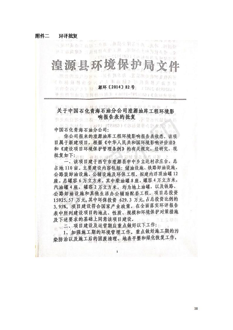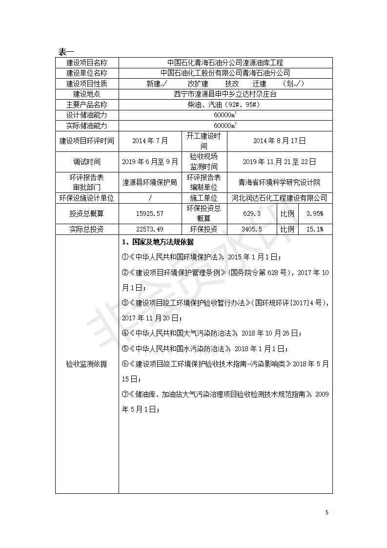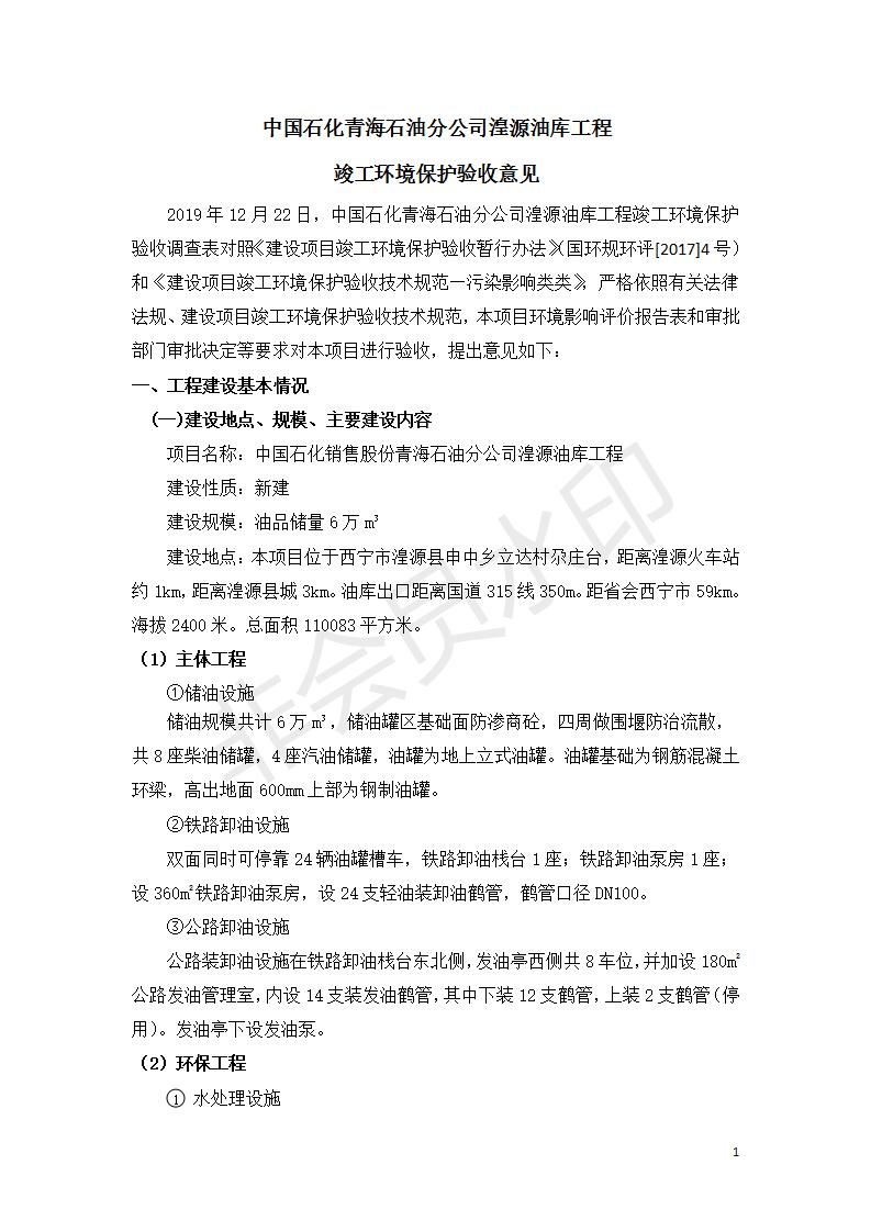 據(jù)中華人民共和國國務(wù)院令第682號《國務(wù)院關(guān)于修改〈建設(shè)項(xiàng)目環(huán)境保護(hù)管理?xiàng)l例〉的決定》和《建設(shè)項(xiàng)目竣工環(huán)境保護(hù)驗(yàn)收暫行辦法》(國務(wù)院令682號),中國石化青海石油分公司湟源油庫工程建設(shè)項(xiàng)目(包括竣工環(huán)境保護(hù)驗(yàn)收監(jiān)測報(bào)告表和驗(yàn)收意見)公示如下。 一、項(xiàng)目名稱:中國石化青海石油分公司湟源油庫工程建設(shè)項(xiàng)目 二、地點(diǎn):西寧市湟源縣申中鄉(xiāng)立達(dá)村尕莊臺 三、建設(shè)單位:中國石化銷售股份有限公司青海石油分公司 四、建設(shè)內(nèi)容:油品儲量6萬m3、其他配套設(shè)施。五、聯(lián)系人:董恒棟 六、聯(lián)系電話:18697130811 七、公示時(shí)間:二〇二〇年三月十三日至二〇二〇年四月十日 公示期間,對上述公示內(nèi)容如有異議,請以書面形式反饋,個(gè)人須署真實(shí)姓名,單位須加蓋公章。