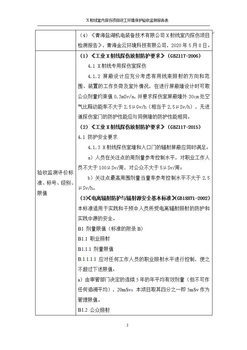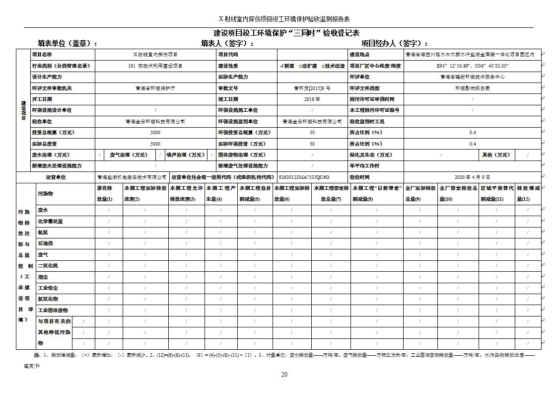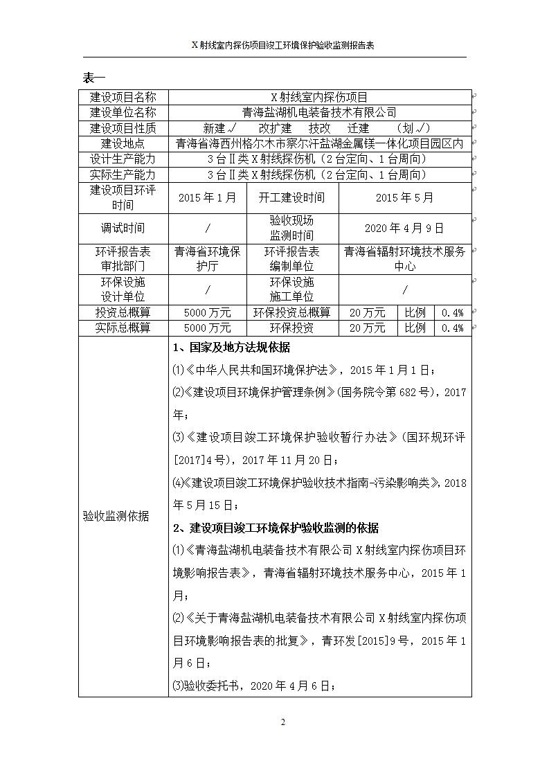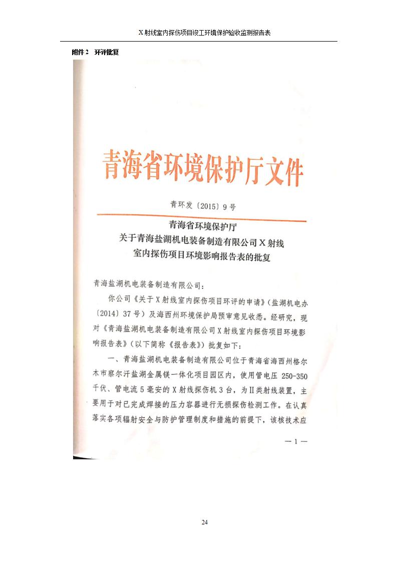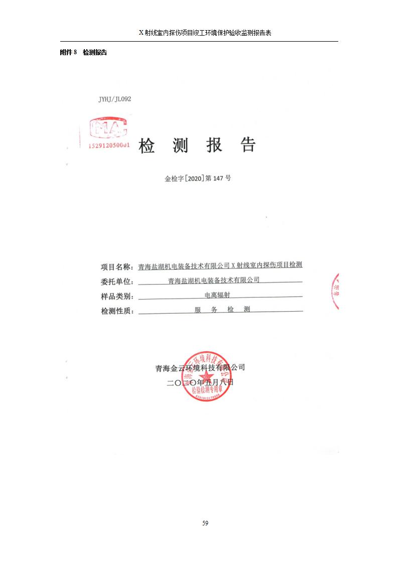 根據(jù)中華人民共和國國務(wù)院令第682號《國務(wù)院關(guān)于修改〈建設(shè)項目環(huán)境保護管理條例〉的決定》和《建設(shè)項目竣工環(huán)境保護驗收暫行辦法》(國務(wù)院令682號),青海鹽湖機電裝備技術(shù)有限公司X射線室內(nèi)探傷項目竣工環(huán)境保護驗收監(jiān)測報告表公示如下。 一、項目名稱:X射線室內(nèi)探傷項目竣工環(huán)境保護驗收監(jiān)測報告表 二、地點:青海省海西州格爾木市察爾汗鹽湖金屬鎂一體化項目園區(qū)內(nèi) 三、建設(shè)單位:青海鹽湖機電裝備技術(shù)有限公司 四、建設(shè)內(nèi)容:本項目位于公司三號車間廠房內(nèi),探傷室長21m,寬9.3m,共有3臺X射線探傷機。 五、聯(lián)系人:楊工 六、聯(lián)系電 話:0971-6515411 七、公示時間:二〇二〇年七月十日至二〇二〇年八月六日 公示期間,對上述公示內(nèi)容如有異議,請以書面形式反饋,個人須署真實姓名,單位須加蓋公章。